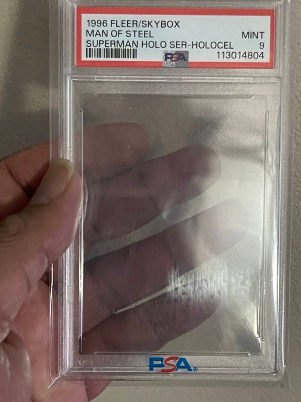 This is the Most sought after 1996 FLEER/SKYBOX Superman Holocel Transparent card. This state of the art card was and still is ahead of its time Created from a Transparent HOLOCEL Material that looks clear to the naked eye but when in contact with lighting you can see Superman over the Daily Planet Globe. This card is hard grade over 8. Even Grade Mint 9 are rare with only 1 Gem Mint 10 in existance. Be one of the few to own a Grade 9 and show your friends this card, Enjoy the Pictures and good luck. Feel free to email me with an offer for this Masterpiece.